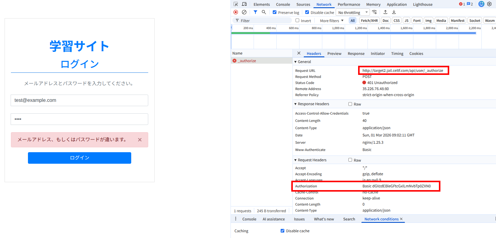 ネットワークタブを開くと実際にリクエストされるURLとBasic認証が使用されている事がわかります。